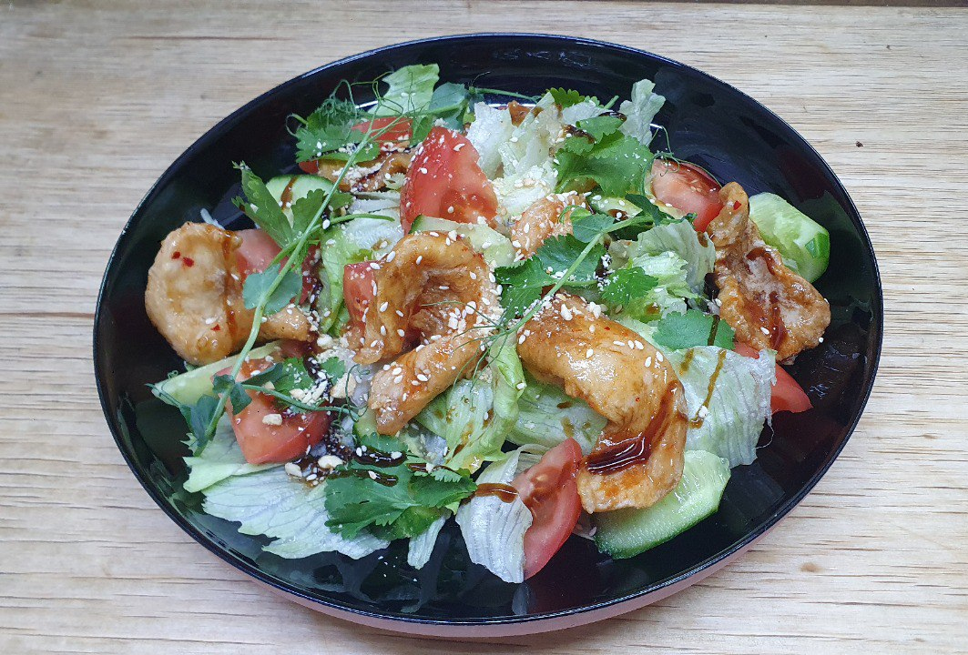 Подается с салатом, маринованным огурцом, томатами, красным луком, сыром чеддер и фирменной заправкой, картофелем фри и кетчупом.