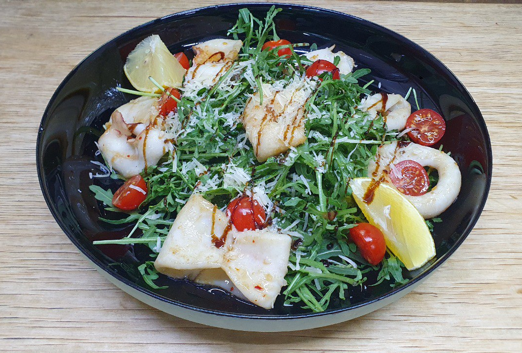 Руккола с печеными тигровыми креветками в сливочно-винном соусе с тархуне.