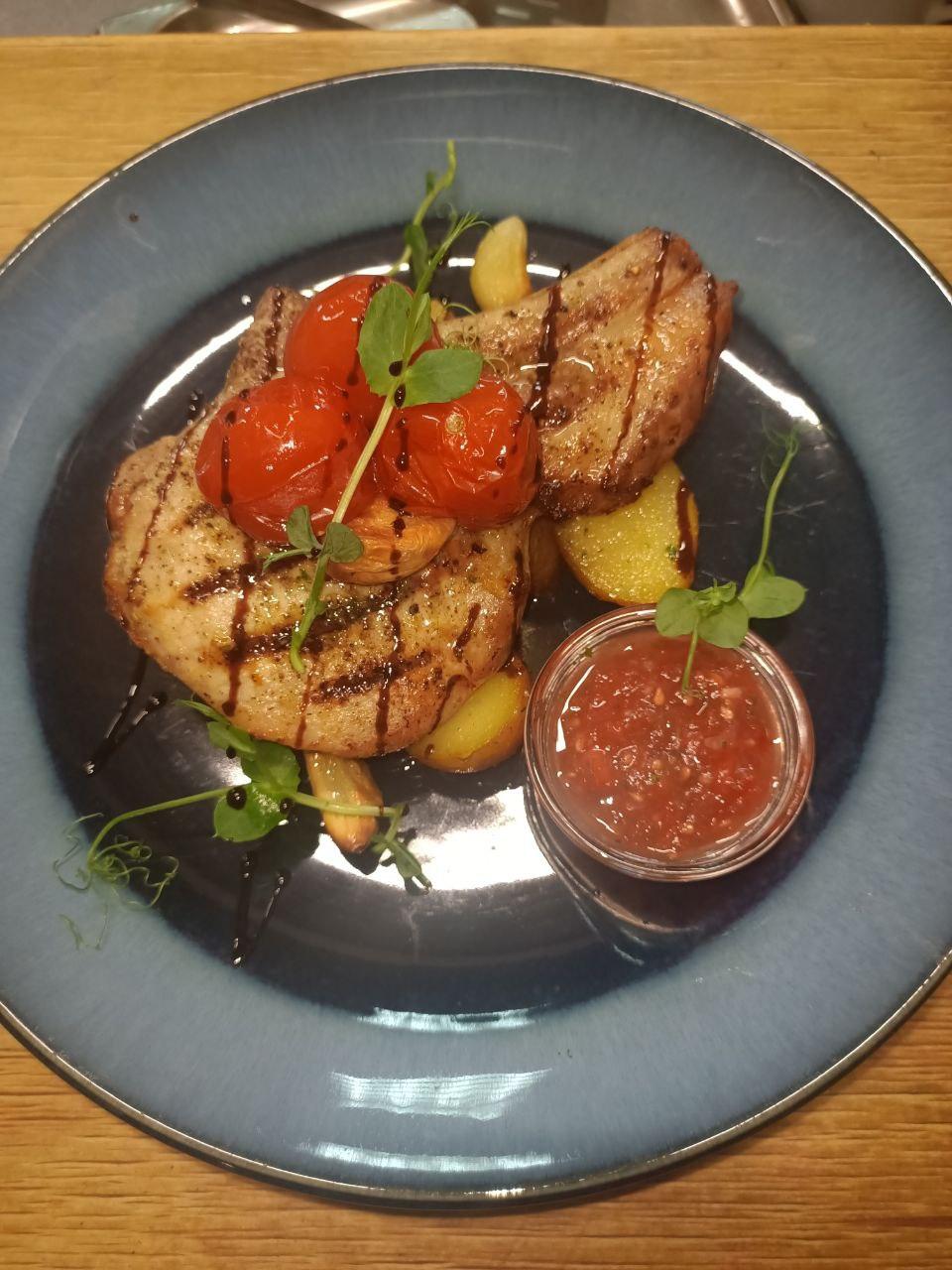 Подается с обжаренным картофелем бэби, печеным чесноком и домашней аджикой