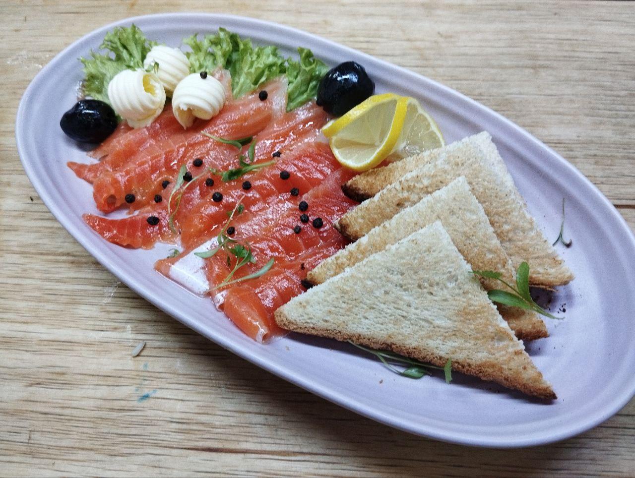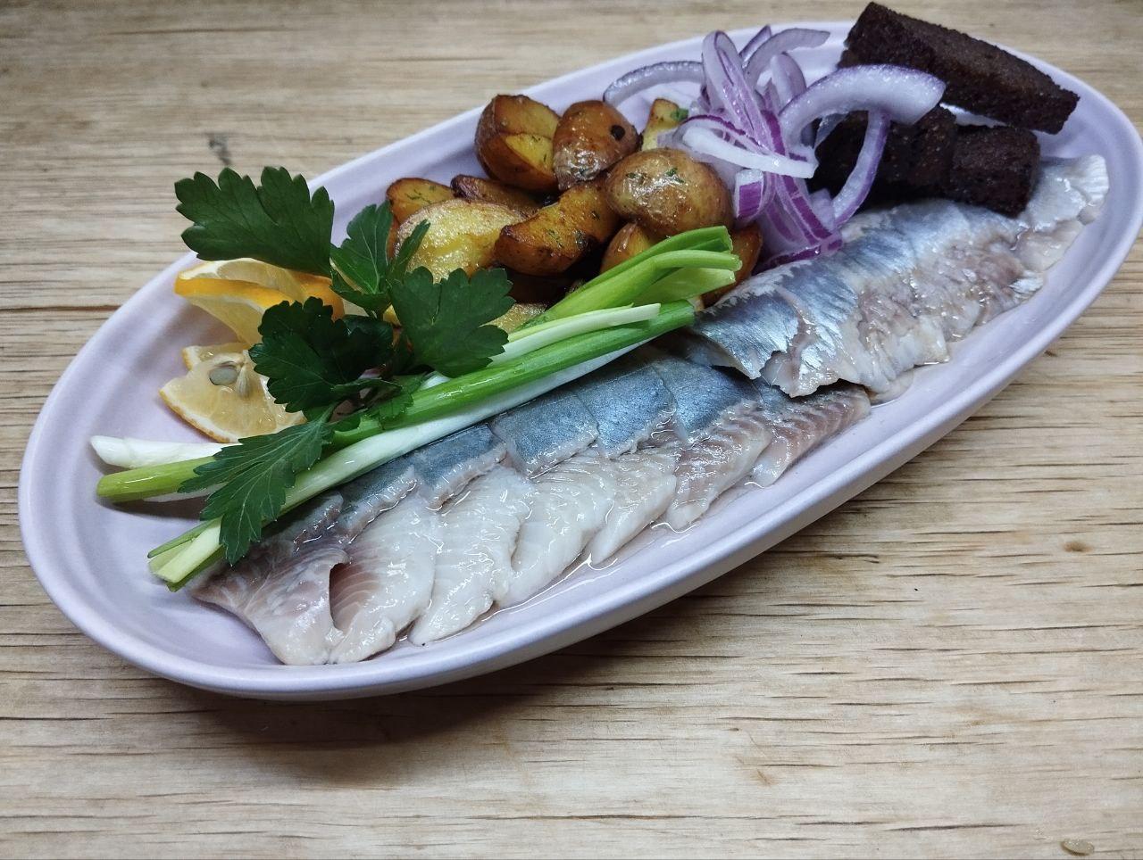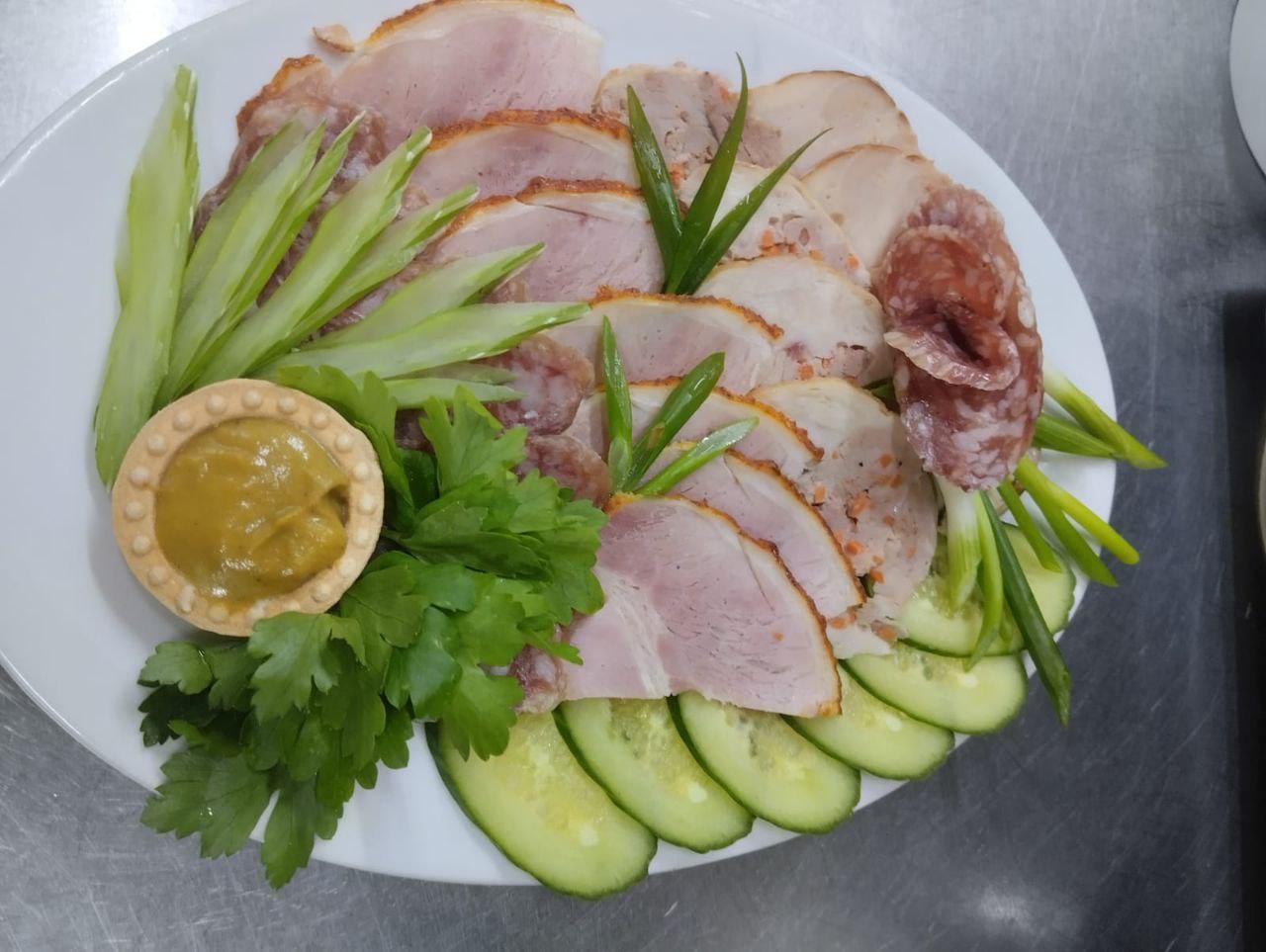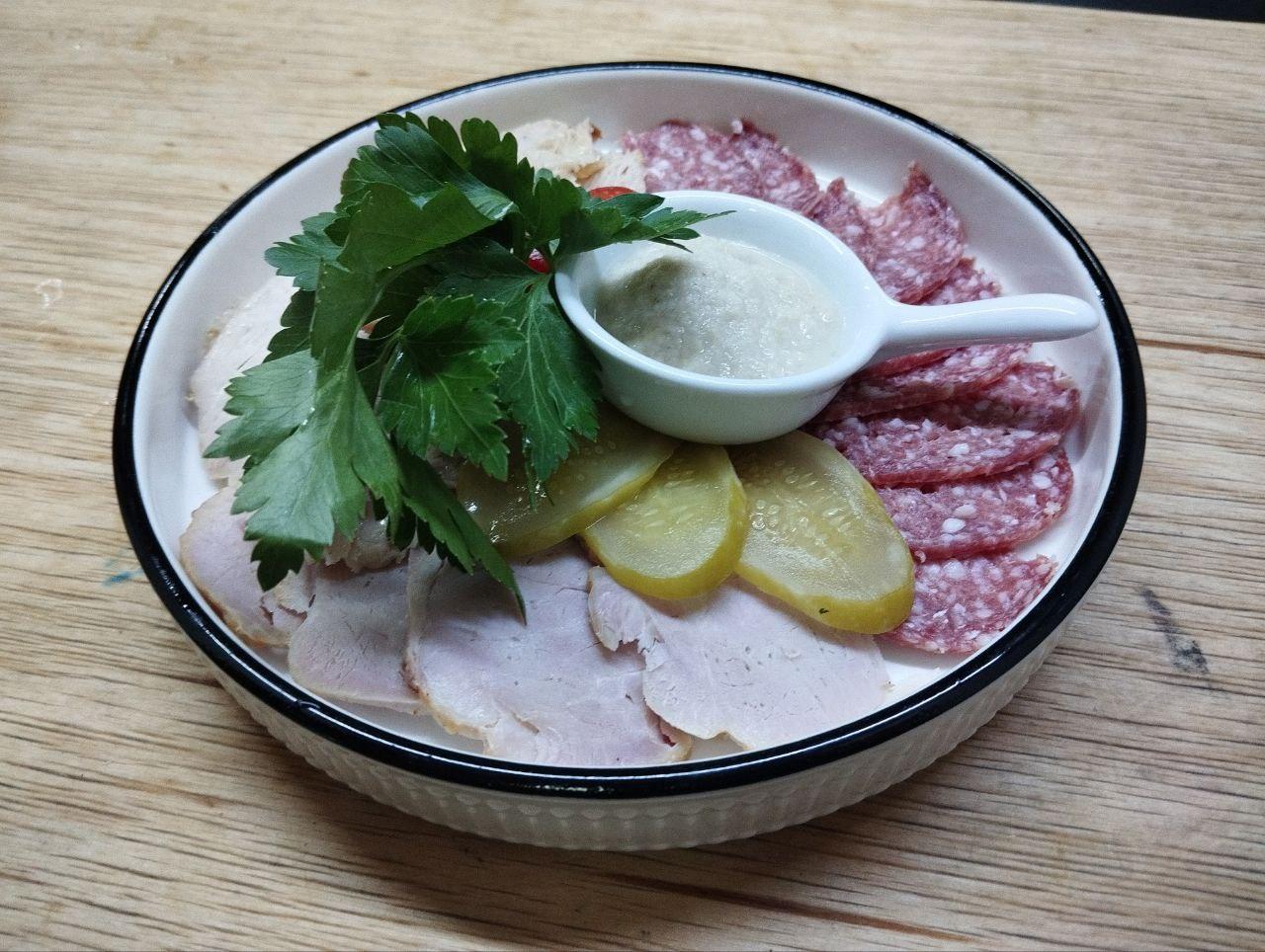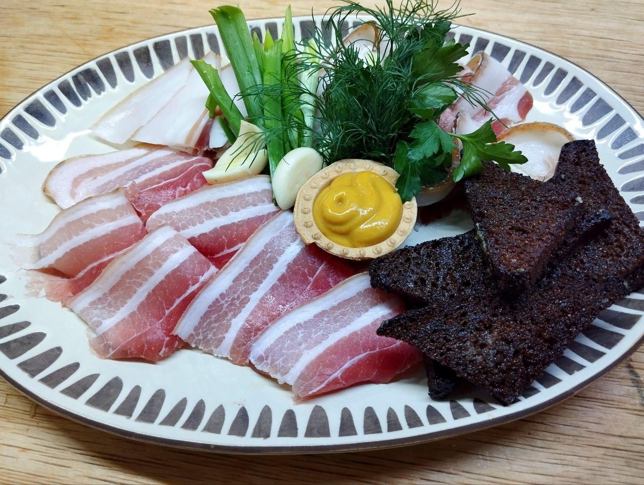 Три вида домашнего сала, гренки, лук, чеснок, горчица.