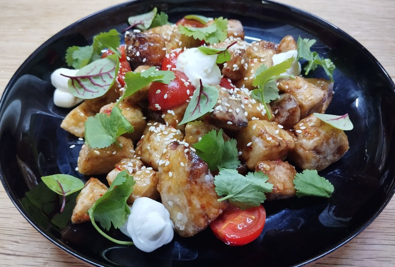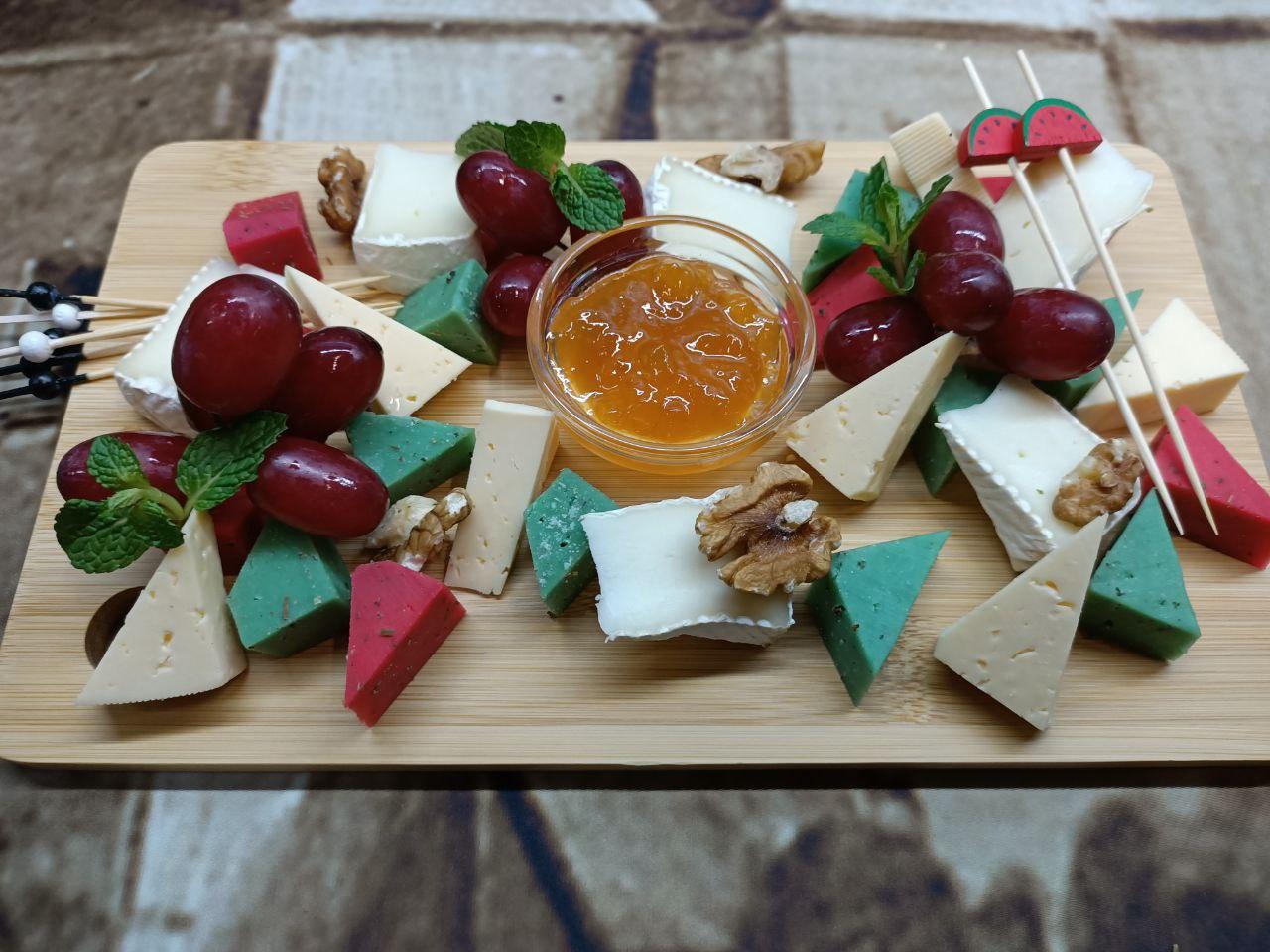 Аккуратно нарезанные соломкой свежие овощи: хрустящая морковь, сочный огурец, сладкий перец, сельдерей, пряный редис и аккуратно разложенные по ячейкам менажницы. Подается с домашним соусом «Блю-чиз».