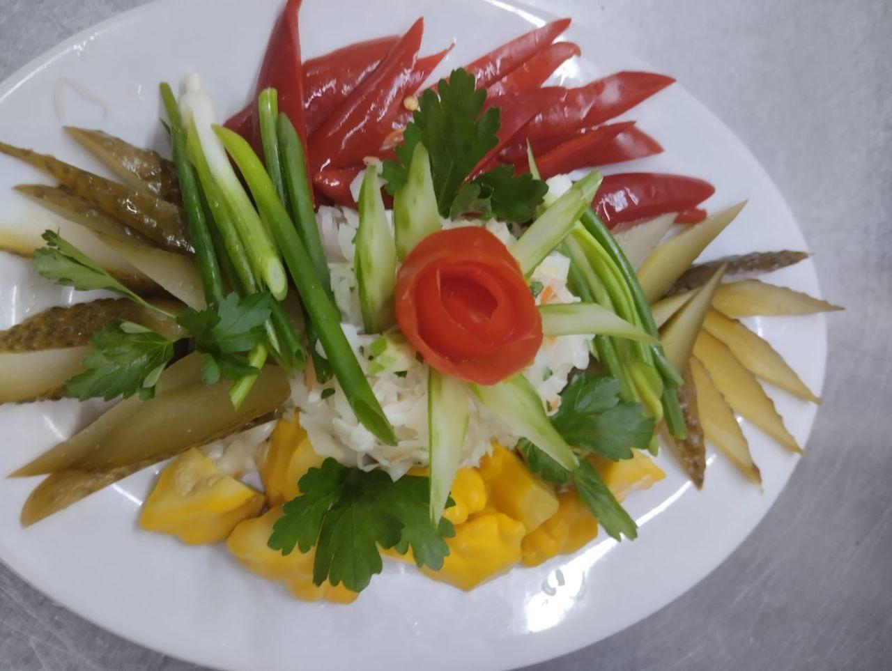 Соленый огурец, маринованный черри, красная капуста соленая, черемша.