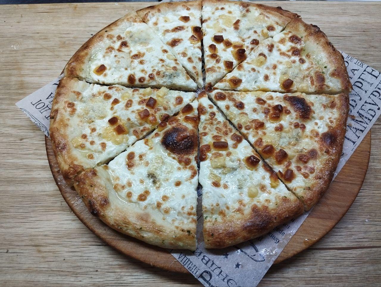 Ветчина, бекон, пепперони, курица, говядина, перец болгарский, сыр Моцарелла, соус томатный.