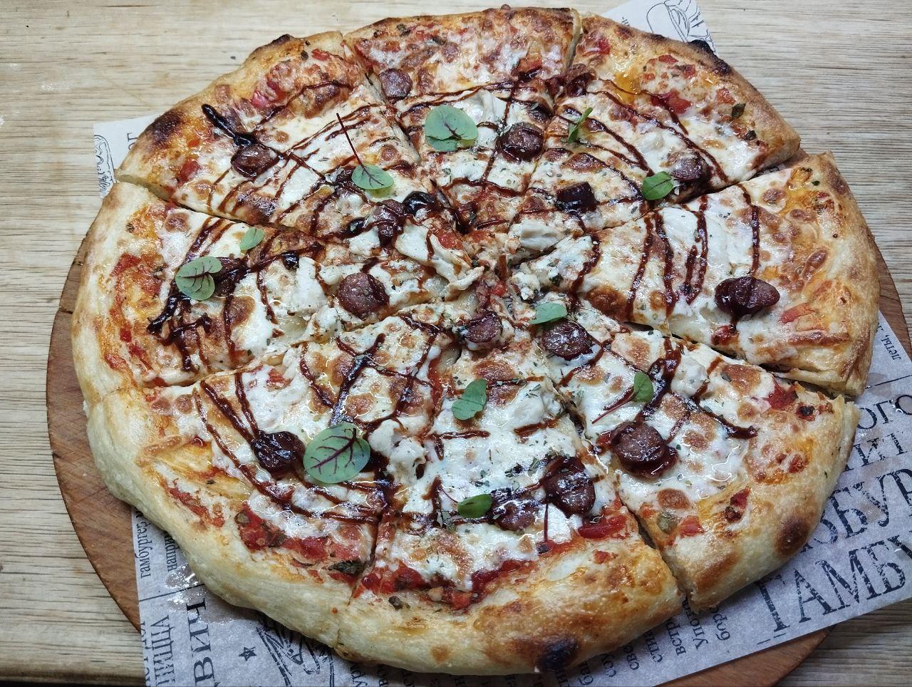 Копченые колбаски, куриное филе, соус томатный, горчица, соус Барбекю, сыр Моцарелла.
