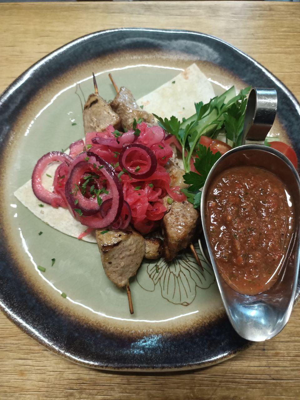Маринованное куриное филе по фирменному рецепту шеф повара. Подается на шпажках.