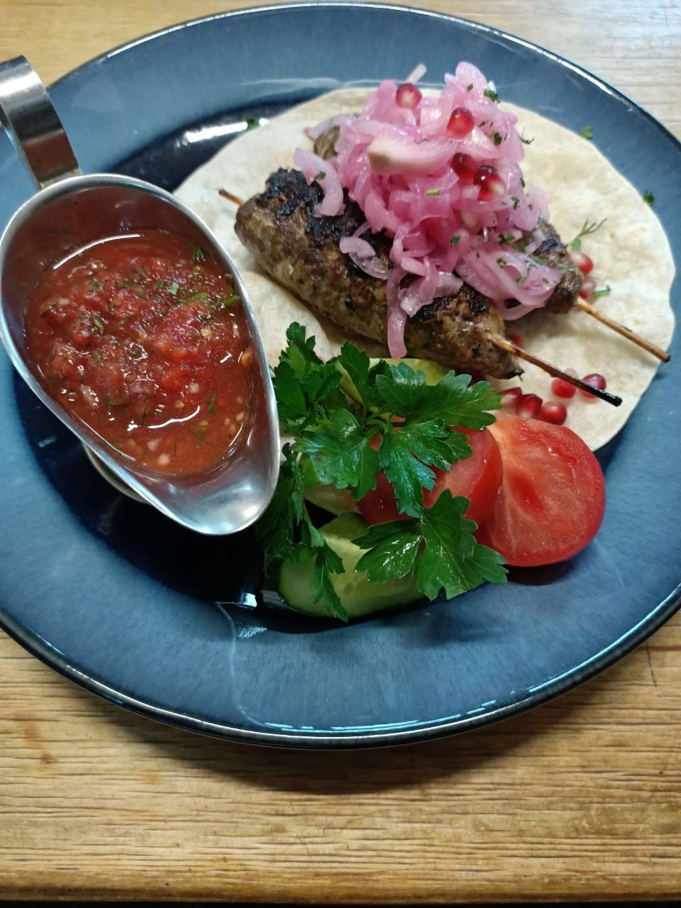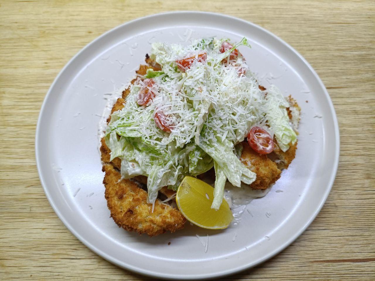 Цыпленок с хрустящей пшеничной тортильей, печеным картофелем, овощами и соусом.