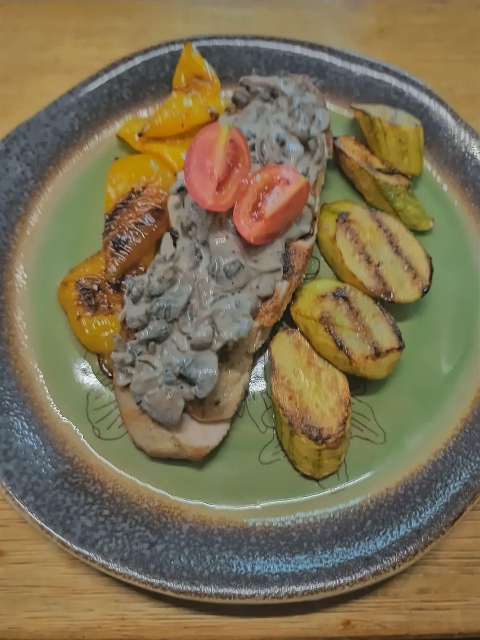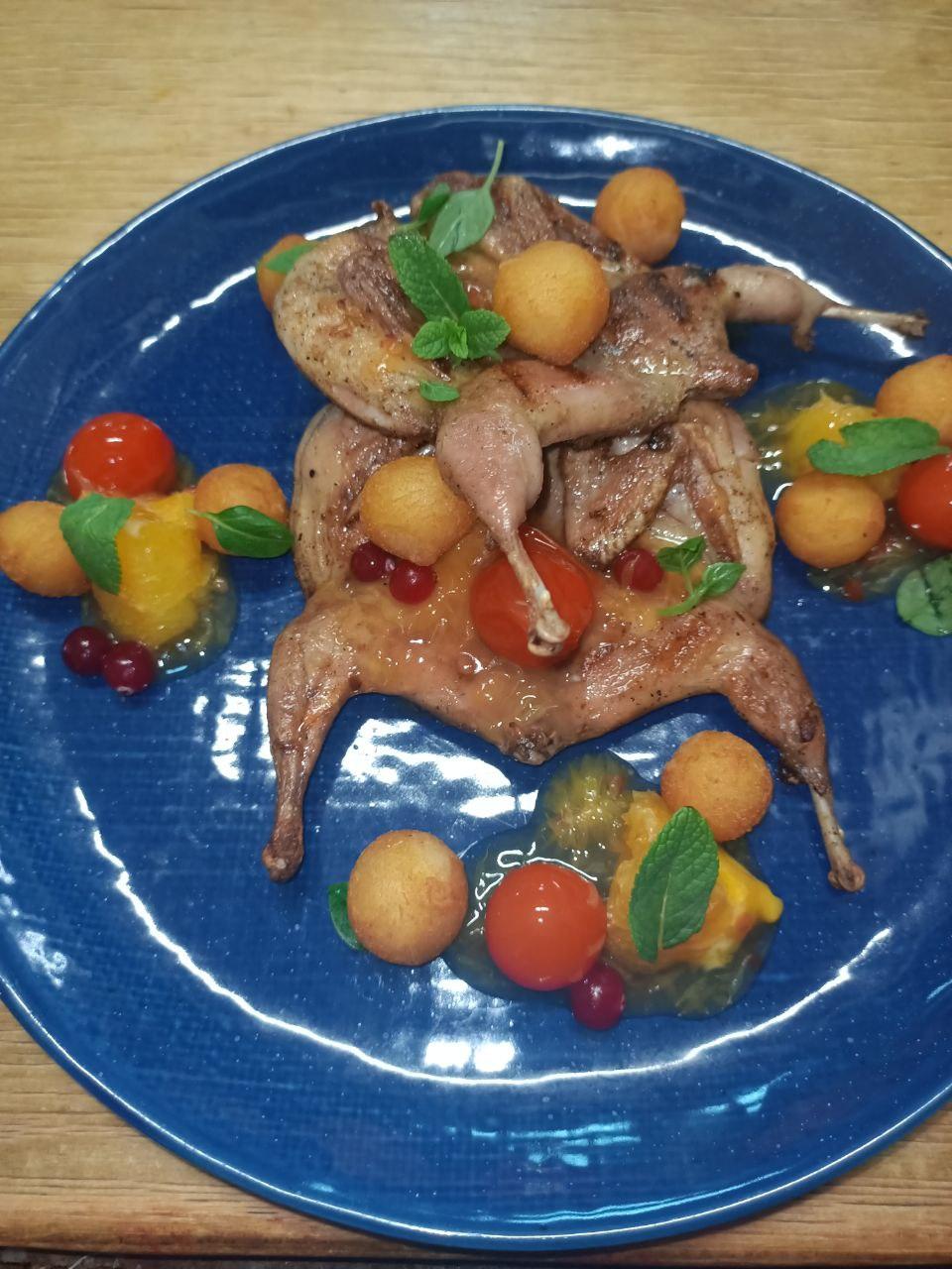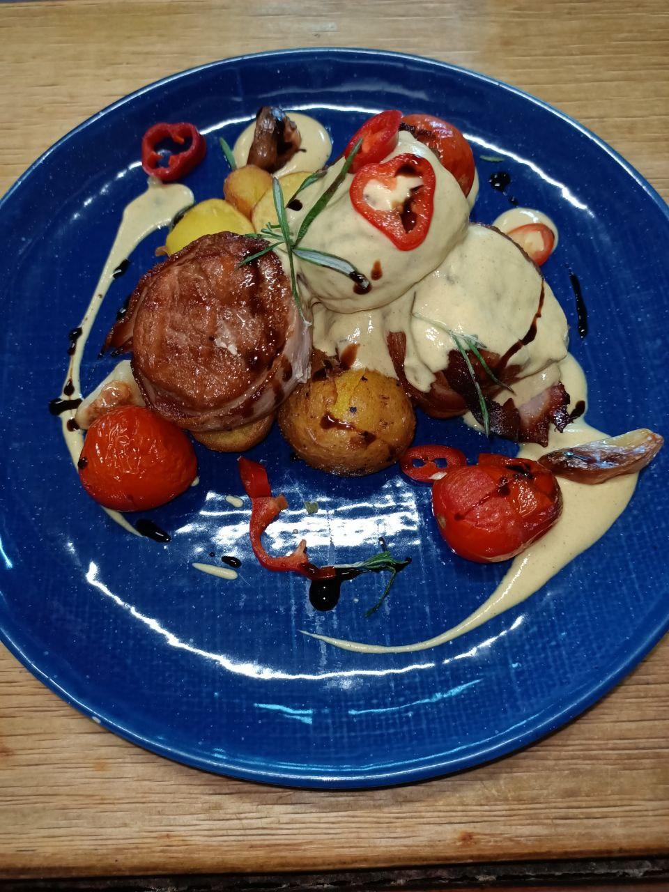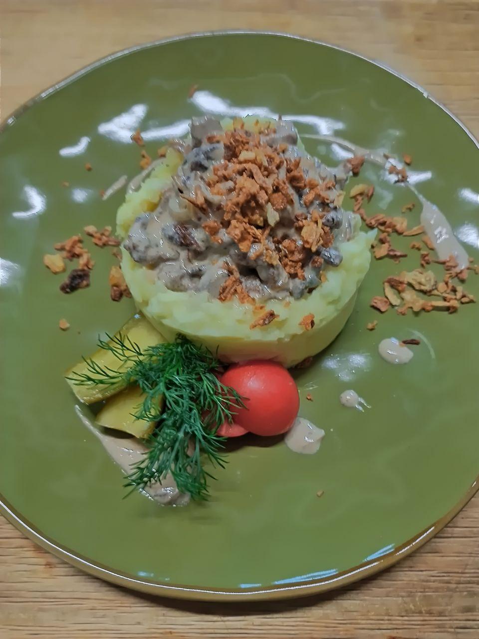 Под горчичным соусом, подается с печеным картофелем и помидорами черри.