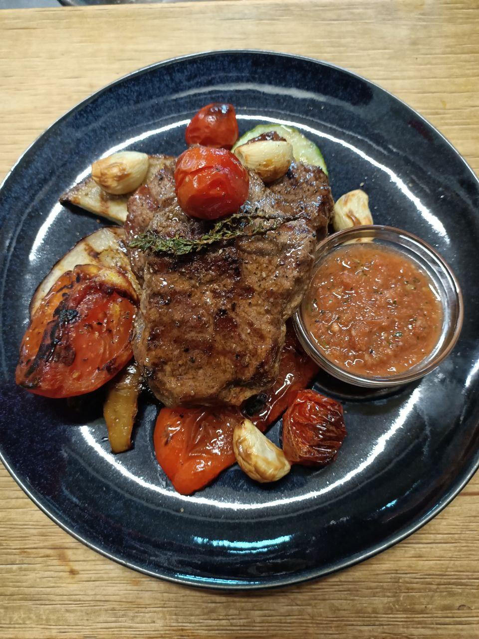 Подается на шипящей сковороде с обжаренными овощами, фасолью, халапеньо