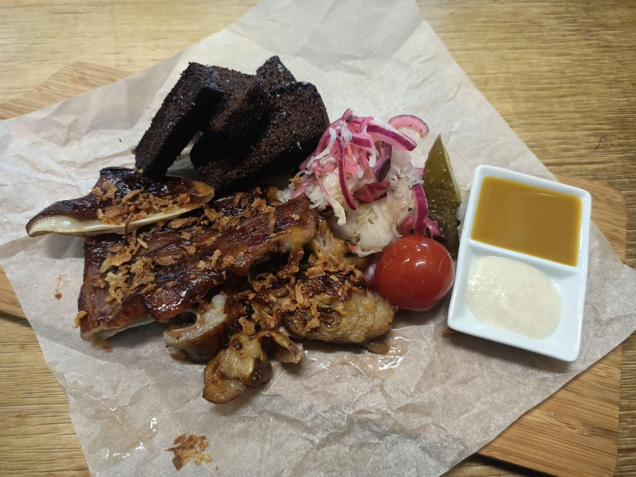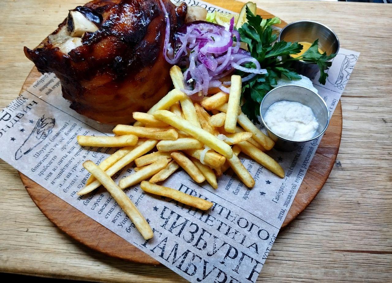 Запеченная в медово-горчичном соусе подается с маринованными овощами, картофелем фри, горчицей и хреном.